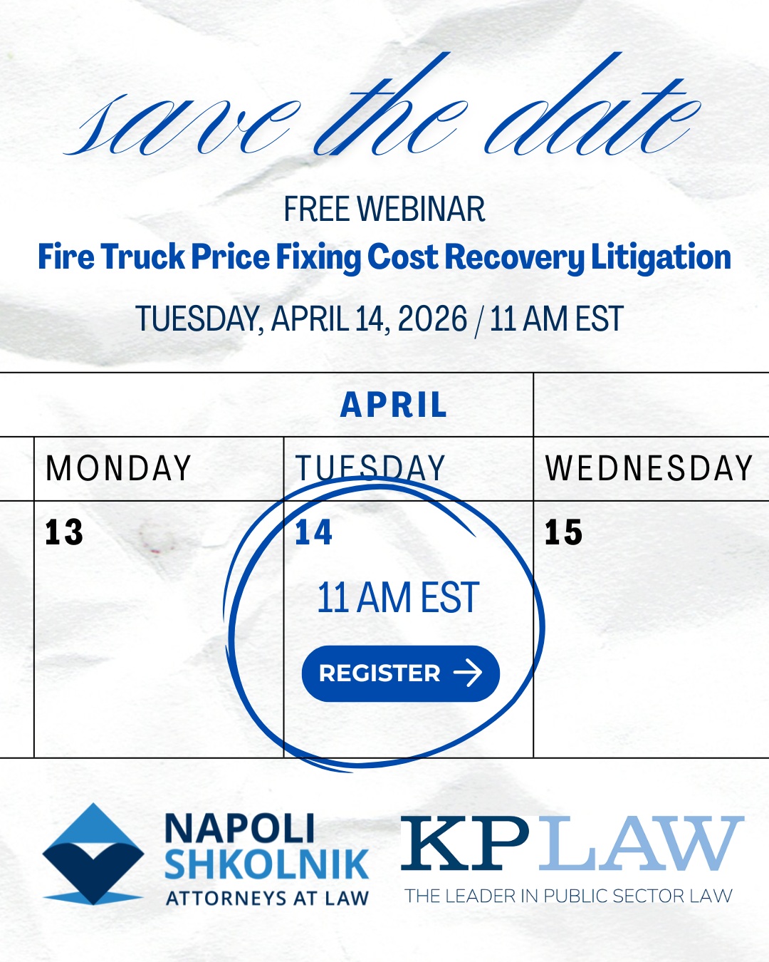 KP Law, in partnership with Napoli Shkolnik, invite you to attend an information webinar on April 14th at 11:00 AM relative to the emerging national fire truck and equipment litigation. The purpose of this webinar is to inform attendees about the anti-trust lawsuits being brought against the three largest fire truck... read more